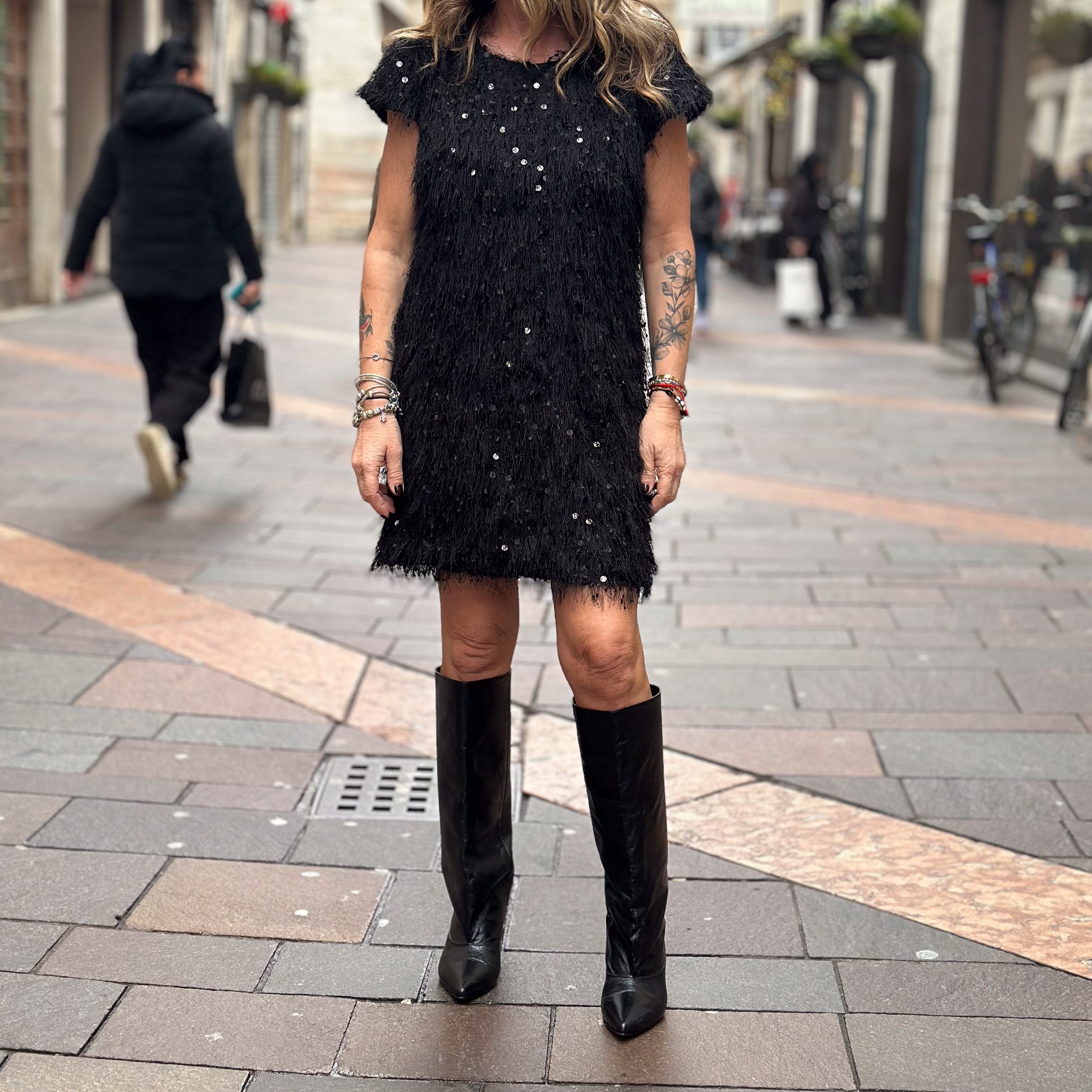 Un outfit pensato per chi ama la raffinatezza senza tempo. Il completo Please in nero (giacca + pantalone) è il cuore del look, elegante e dalle linee pulite, perfetto per ogni occasione in cui vuoi sentirti sicura e sofisticata.