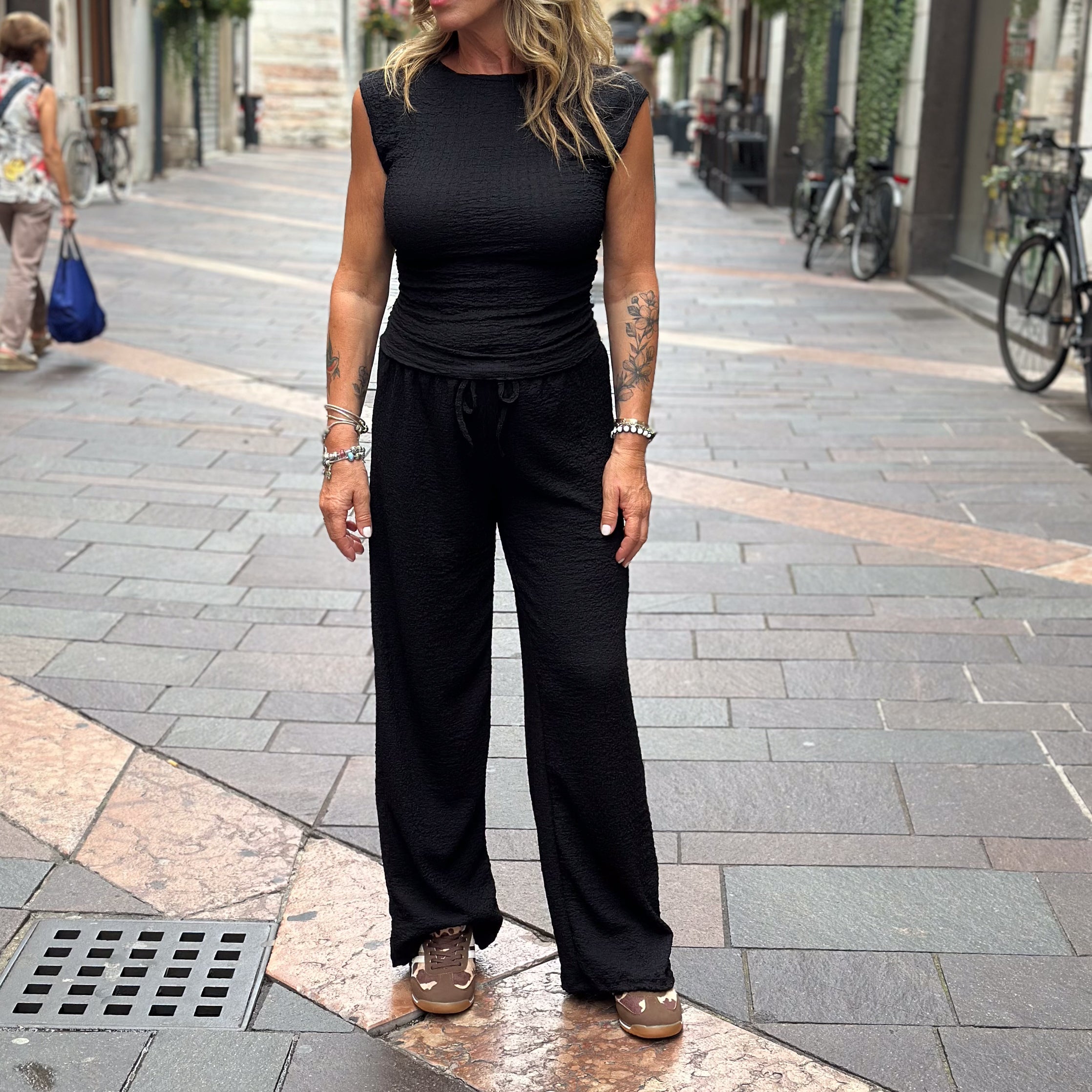 Maglietta smanicata disponibile in marrone e nero, perfetta da indossare da sola o abbinata al suo pantalone coordinato per creare un completo elegante e moderno.