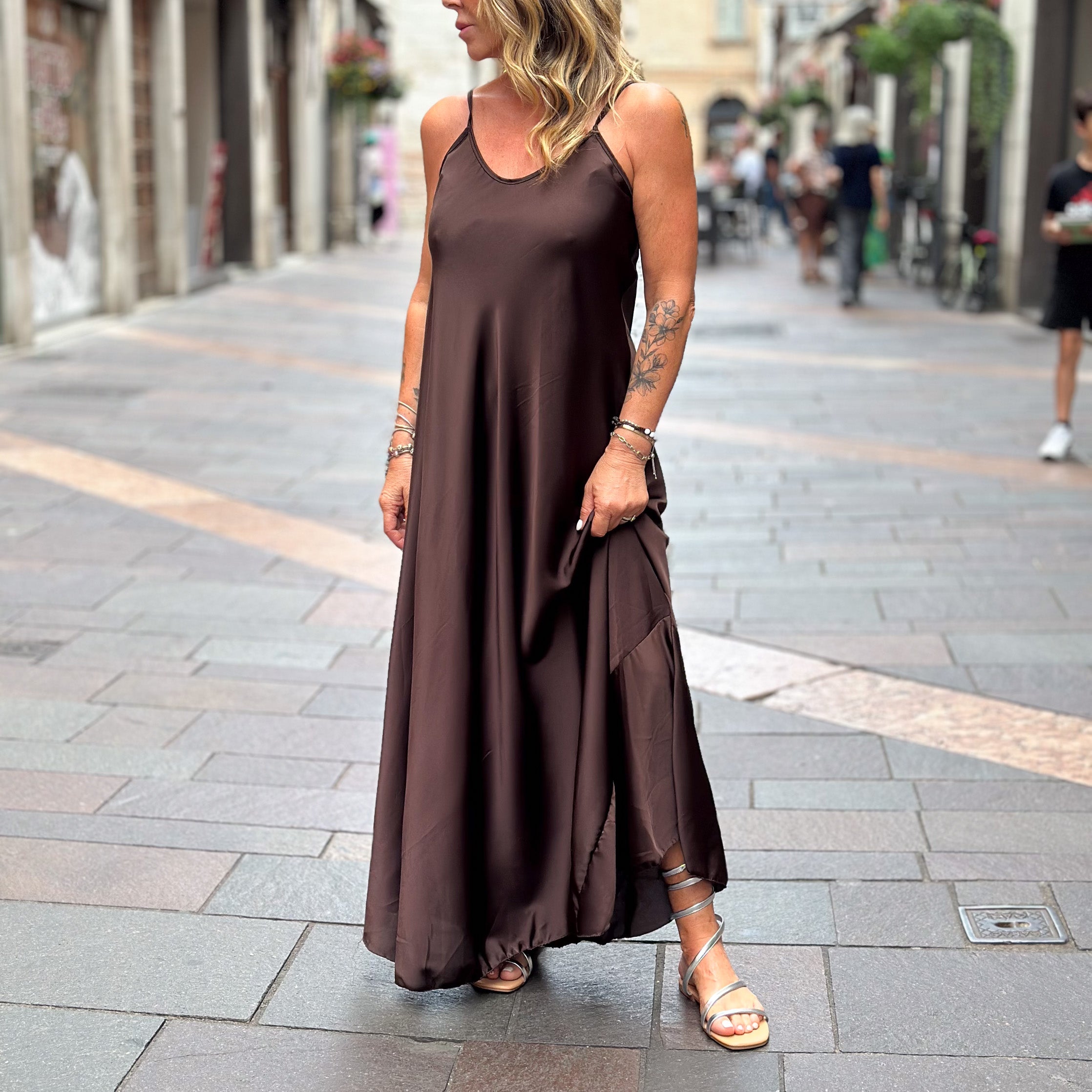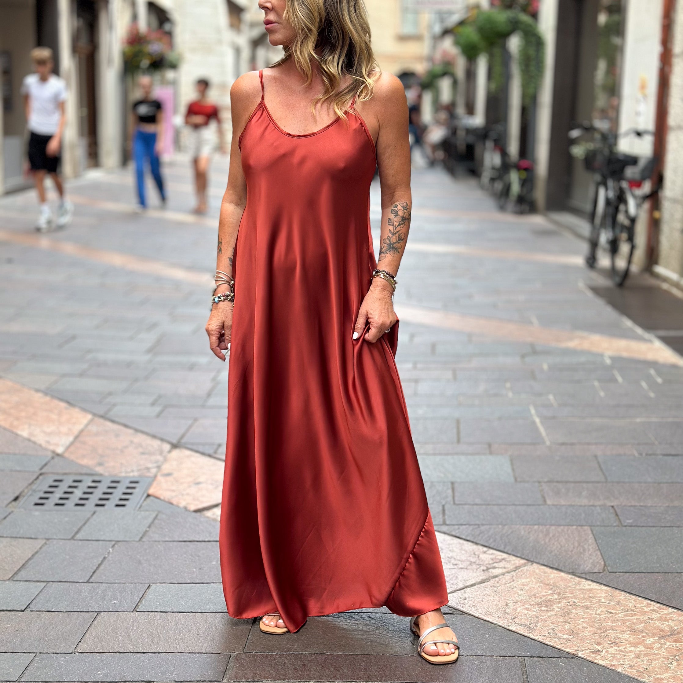 Musa è l’abito che scivola addosso come una carezza. Il raso leggero cade morbido e dona una silhouette fluida ed elegante, perfetta per le sere d’estate o un’occasione speciale. I colori? Vivi, brillanti, scelti apposta per esaltare l’abbronzatura e portare luce anche nei giorni più caldi. Lo indossi e sei subito in mood vacanza, anche in città.