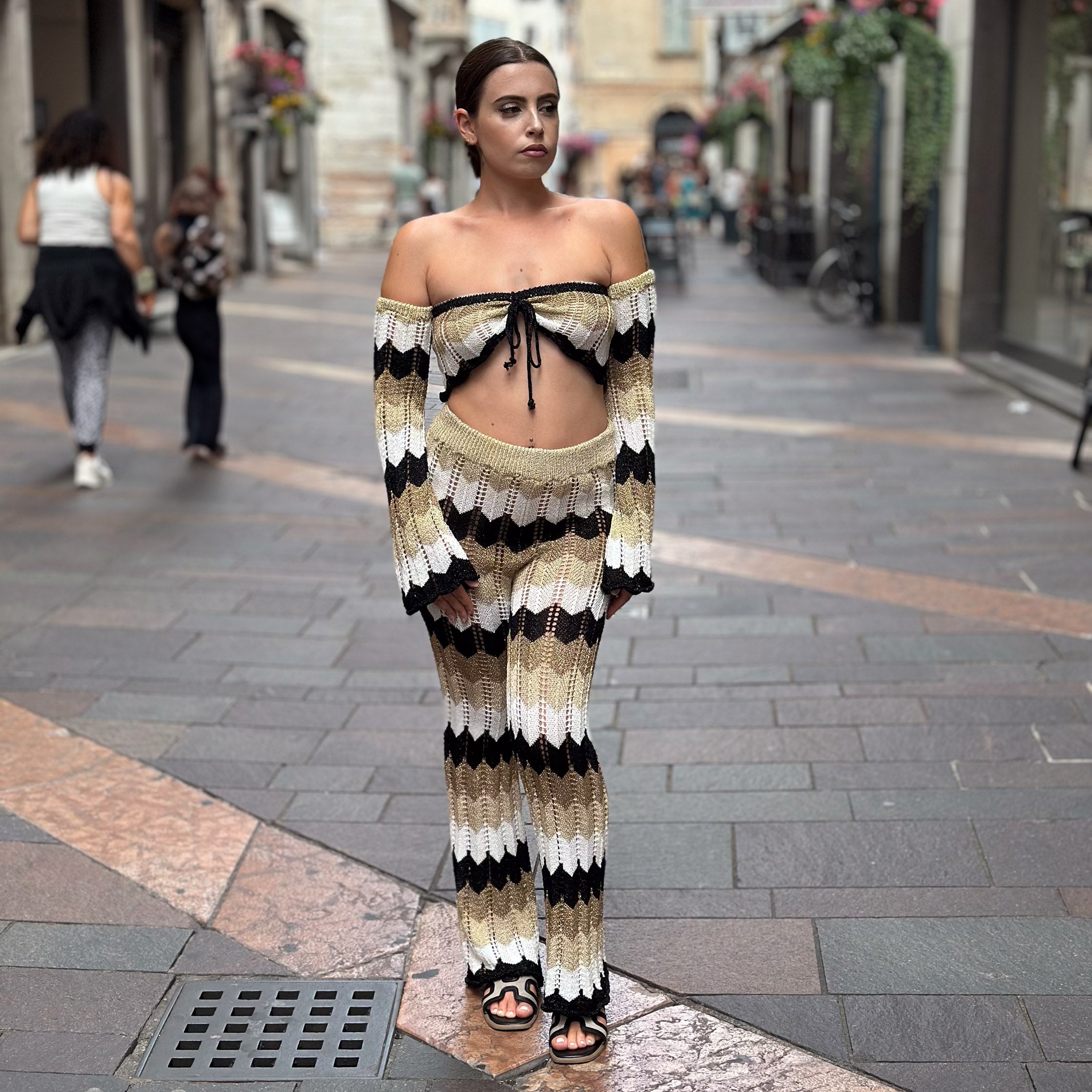 Stephanie è il completo che fa subito vibrare di personalità: fantasia un po’ optical, top corto e pantalone lungo dal taglio comodo ma super cool. Perfetto per chi ama i look decisi e vuole farsi notare senza rinunciare alla comodità.