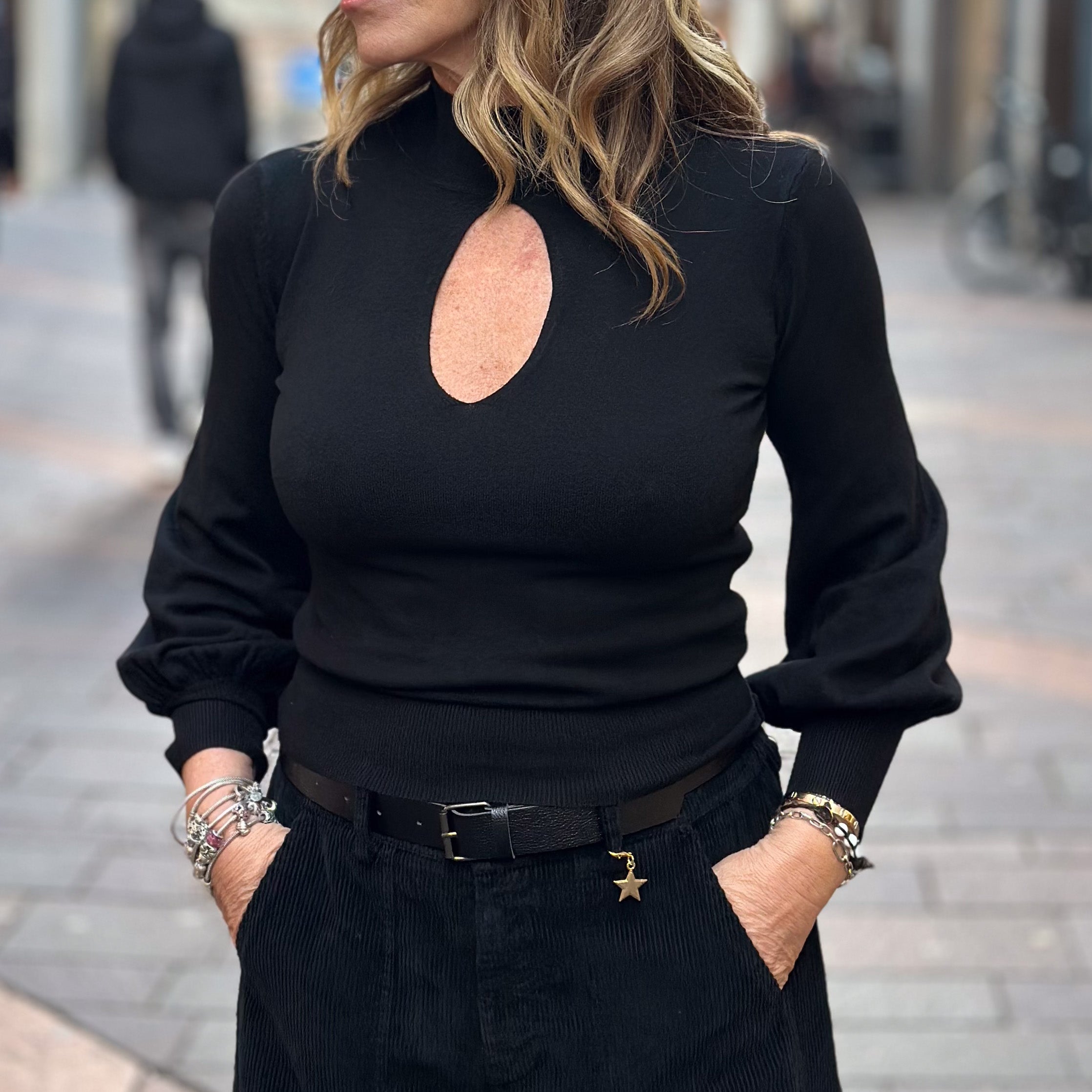Il tessuto è morbido e leggero, si infila sotto qualsiasi giacca senza fare volume, mentre la manica a sbuffo aggiunge quel dettaglio chic che fa subito “outfit curato”. La piccola goccia sul décolleté illumina la linea senza essere troppo, giusto il dettaglio che fa la differenza.